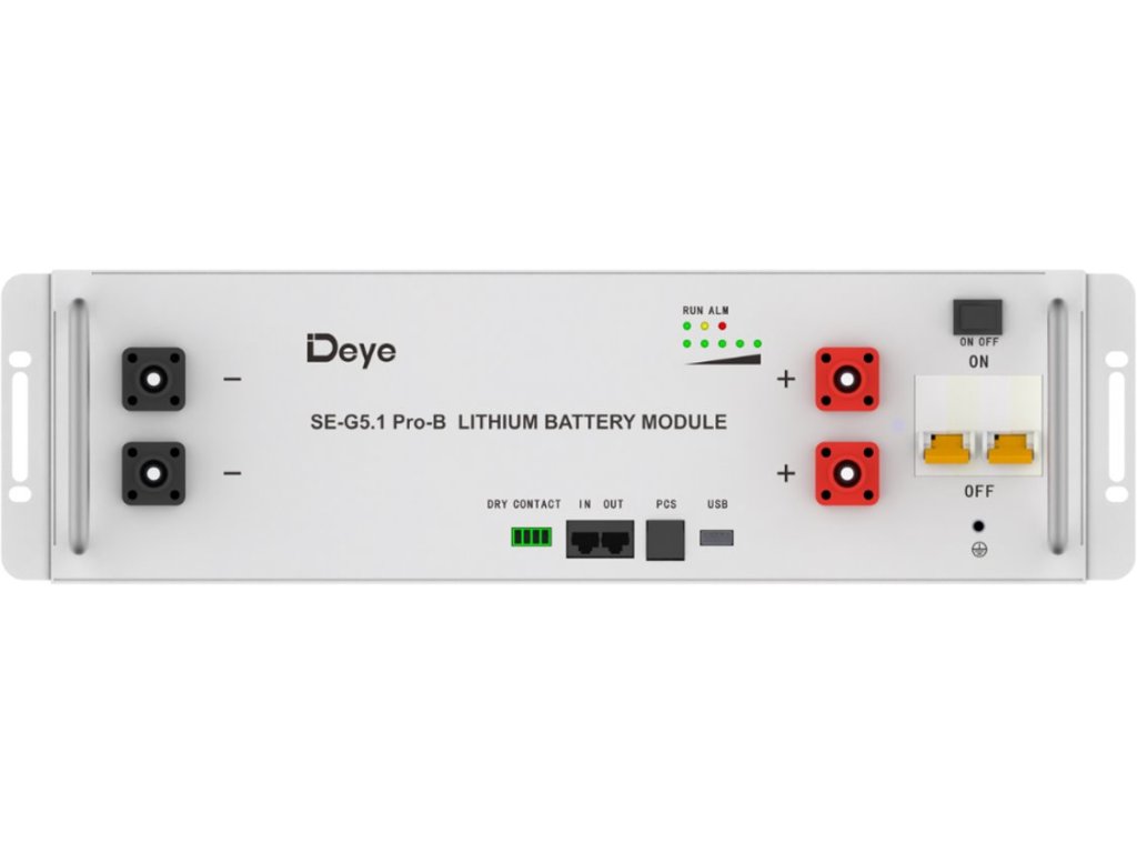 Vestavěný Battery Management System (BMS) inteligentně řídí provozní podmínky – od napětí a proudu, přes teplotu článků, až po vyrovnávání jednotlivých buněk. Díky tomu baterie pracuje stabilně a bezpečně i při vysokých zatíženích nebo dlouhodobém provozu. Modul se snadno instaluje do racku (19”) a podporuje komunikaci přes RS485 a CAN2.0, což umožňuje přímé propojení se střídači Deye i systémy dalších značek.